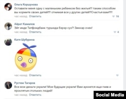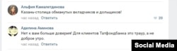 Кто-то написал слово "чупряк", что по-татарски означает "тряпка". Кто-то вопрошает: "Хватает совести доброе утро желать?" Кто-то пишет по-татарски: "Әйт инде Татфондбанк турында берәр сүз. Зинһар өчен!" ("Ну скажи уже о Татфондбанке хоть слово. Пожалуйста!").