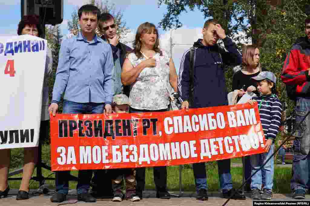"Казань — столица обманутых дольщиков!", "Мы хотим в свой дом!", "Президент РТ, спасибо вам за мое бездомное детство", "Ждем возобновления строительства", "Наши дети тоже хотят жить в своих квартирах" — с такими плакатами вышли митингующие. Смотрите другие наши фотогалереи здесь.