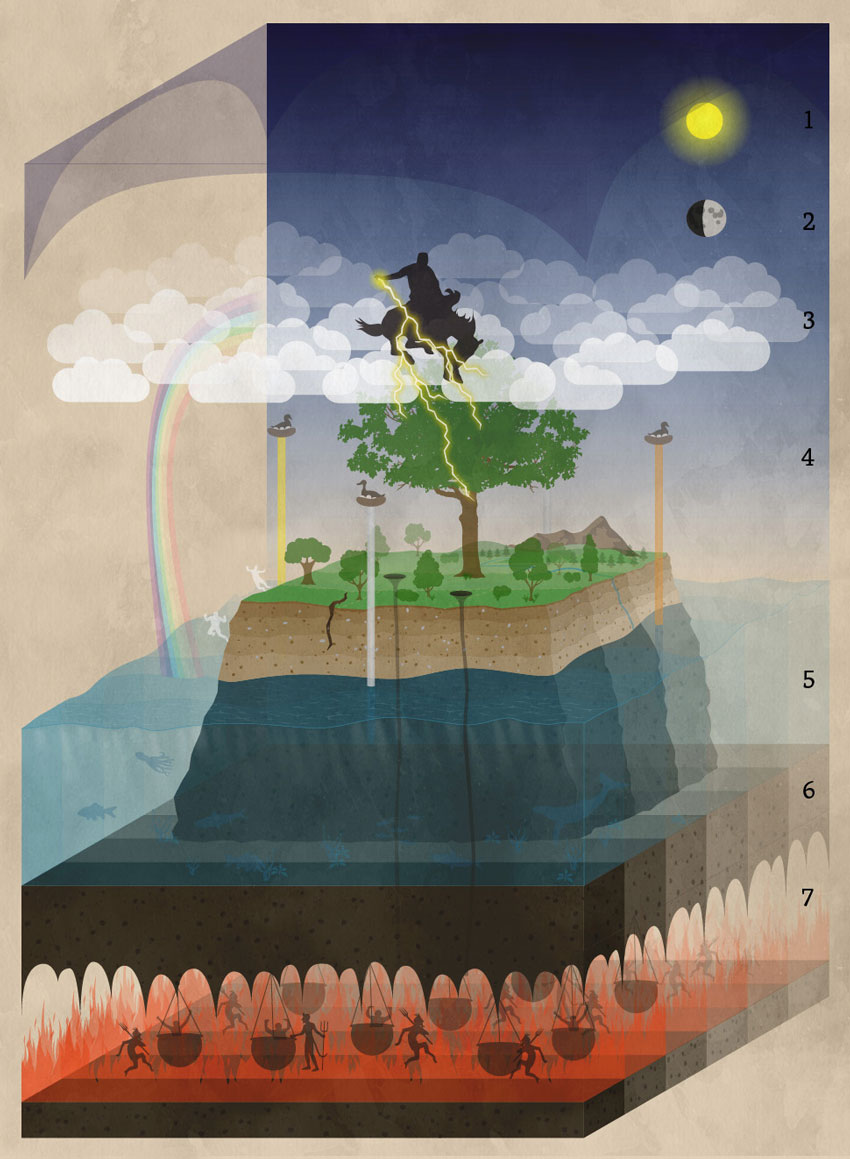 В одном из верхних ярусов живет бог пирешти Кебе, его главная задача — передавать молитвы людей богу. Чуть ниже него находится Солнце, потом Луна.
