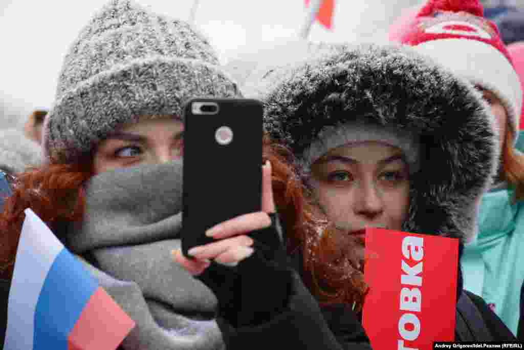 Протестующие держали в руках флаги России, красные воздушные шары, таблички со словом "забастовка", плакаты "18 марта выбираю забастовку", "Мне стыдно голосовать", "Сам не иду и вам не советую!", "Мне некого выбирать!"
