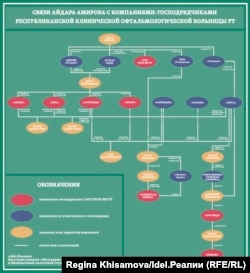 Напомним, владельцами Булгар банка являлись Ольга Бронникова и Ринат Рахимов. Бронникова входила в совет директоров банка и до 2004 года была директором ООО "Фирма "Руслан", принадлежащей Амирову. Также она владела ООО "Линкс" (до 2013 года), ООО "ОФК" (до 2008 года) и ООО "АстраМед"(до 2014 года) — господрядчиками РКОБ. Компанией ООО "Зенит" она владеет до сих пор. Сейчас этими компаниями владеют и управляют Фарид Валиуллин и Аскар Байдуллин. Последний — до 2016 года был главврачом клиники "Күзләр" (дочка — ООО "Вита"). Как отмечает анонимный источник, Валиуллин — дядя Байдуллина. "Idel.Реалии" подтвердить или опровергнуть это не удалось.
