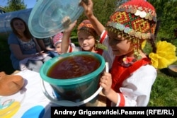Владислав Эльмень выносит ковш с пивом и поет старинное приветствие. Потом наш провожатый, ученый-филолог и председатель Центрального совета чувашских старейшин Виталий Станъял, расскажет, что в приветствии содержится старинная формула, которую можно перевести следующим образом: если нет медового пива, то найдем хмельной отвар. Медовые сорта пива — симбыл и шербет — считались дорогими из-за того, что целебным был ключевой ингредиент — мед (медовым пивом нас, конечно, тоже угостили).