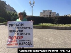 "Украли 120 млрд рублей, вернули 114 млн. Позор нашей власти за этот обман народа", — сегодня у пенсионерки новый плакат. К ней до прихода журналиста "Idel.Реалии" подходил полицейский, спрашивал о цели пикета и просил показать документы.