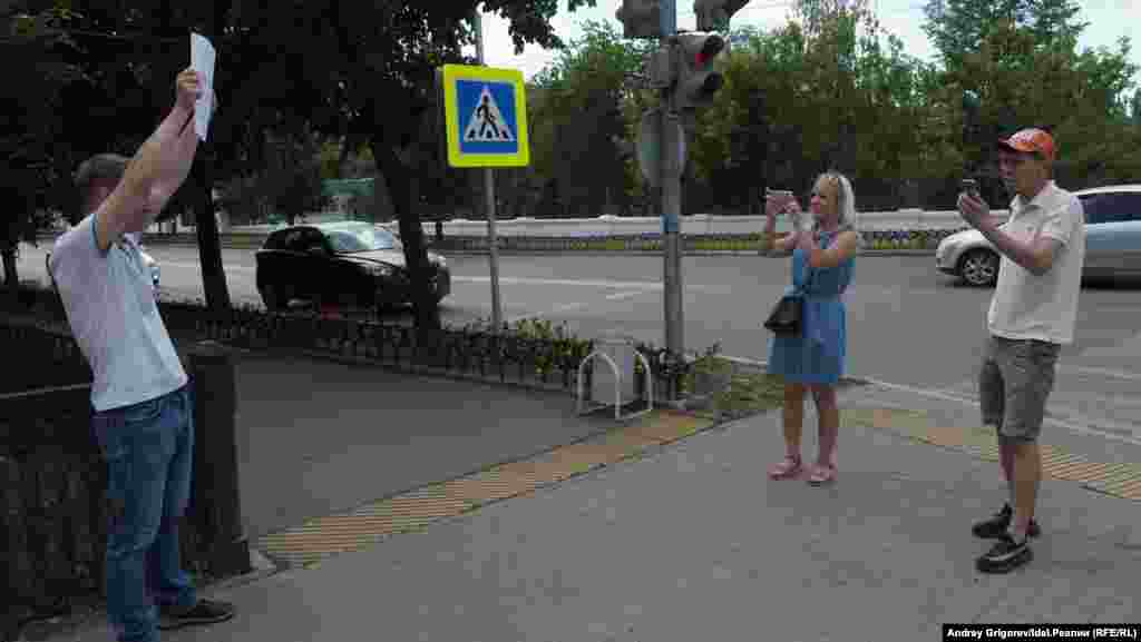 Пикетчики расположились через перекрёсток наискосок от МВД. Прохожих было немного. Вскоре к членам ассоциации подтянулись участники завершившегося пикета на Баумана. Участники протеста по очереди выходили со своими плакатиками к перекрестку. Остальные в это время стояли в тени или прогуливались по Ленинскому саду. Главными же зрителями оказались сотрудники МВД по РТ. Рядом с местом пикета припарковались две полицейские машины. Люди в форме и сотрудник центра "Э" в штатском собирали личные данные участников.