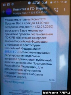 Госсобрание Башкортостана, как выяснилось, кулуарно одобрило пакет поправок к Конституции России, внесенный президентом РФ Владимиром Путиным в Госдуму. Процедура одобрения была осуществлена вне пленарного заседания, при помощи опроса (предусмотрен регламентом Курултая); при этом, депутаты опрашивались разными способами — кто-то лично, кто-то по телефону, а кто-то и по мессенджеру WhatsApp. Некоторые парламентарии заявили, что были не в курсе этой процедуры и не участвовали в голосовании.