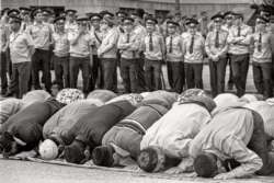 "Это 1991 год, намаз на площади Свободы. Этот снимок среди прочих я вывозил в Турцию, как только открылся железный занавес. Были музыканты, художники и моя выставка о Татарстане. И у этой работы всегда скапливались люди. Почему полиция не молится? У них все молятся, потому что пришло время намаза.