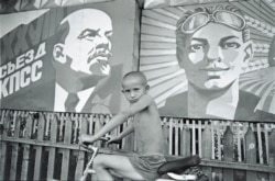 "Это сельский житель на фоне советской агитации. Всё мясо и всё зерно увозили из республики, поэтому в деревнях не очень богато жилось, будем так говорить. И вот мальчик в одних трусиках запечатлен на фоне этих плакатов. Очень сильно была развита агитация, на нее в СССР не жалели. Была такая нарисованная, красивая жизнь. А рядом была совсем другая жизнь, настоящая. И этот мальчик как раз символизирует её".