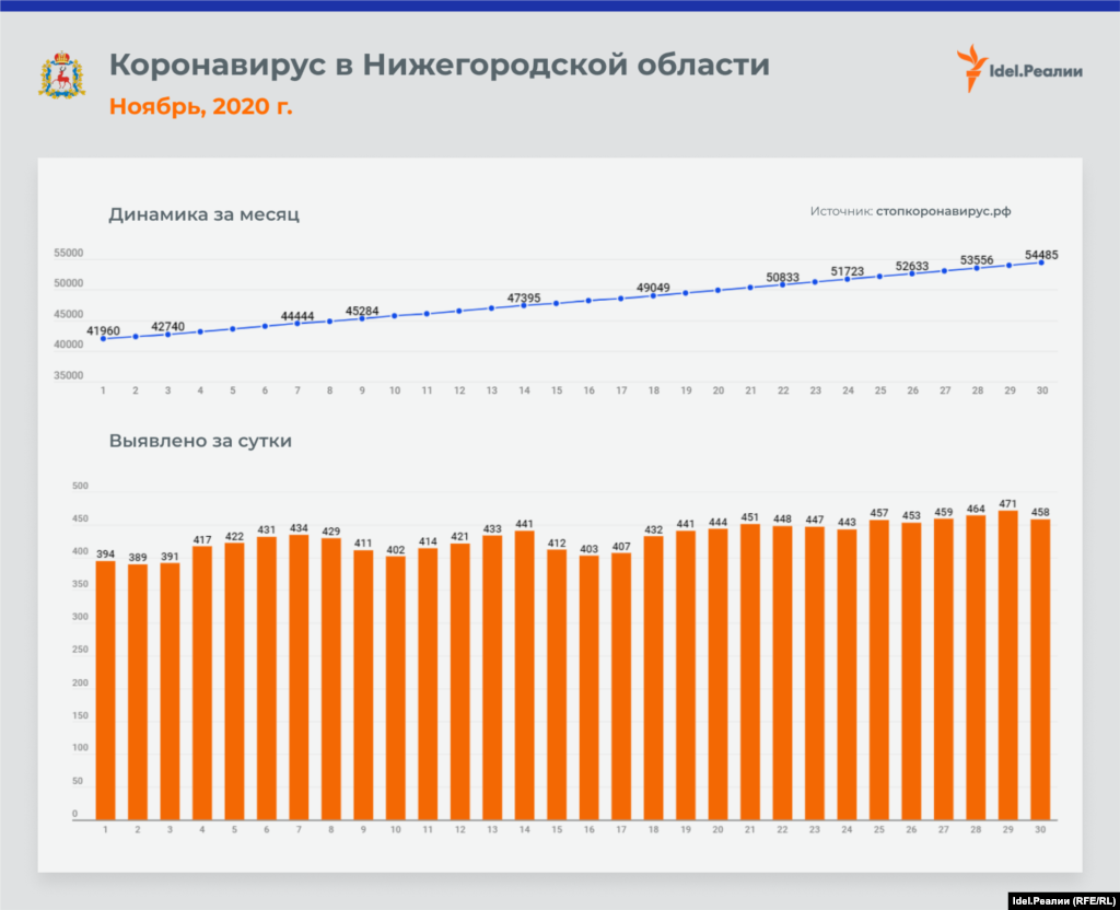 Если в начале месяца в Татарстане ежедневно выявлялось 45 случаев заражения коронавирусной инфекцией, то к концу ноября эта цифра почти удвоилась — до 84-х. В процентном соотношении это наибольший рост среди всех регионов Приволжского федерального округа — наряду с Чувашией и Пермским краем. А вот в Оренбургской и Пензенской областях на протяжении всего месяца цифры практически идентичные: ежедневно выявлялось чуть ли не одинакое количество случаев инфицирования.