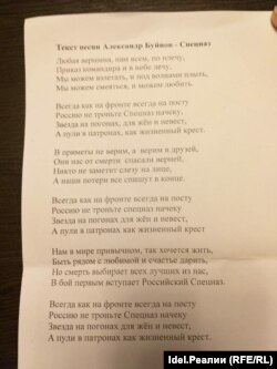 Собеседник "Idel.Реалии" переслал нам переснятую на смартфон страницу распечатанного для разучивания текста. Автор песни на распечатанном листе значится поп-певец Александр Буйнов.