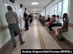 Перед несколькими кабинетами на четвёртом этаже скапливается очередь — полтора десятка пациентов, не меньше. Преобладают пожилые люди. Социальную дистанцию почти никто не соблюдает. Маски у многих под носом или на подбородке.