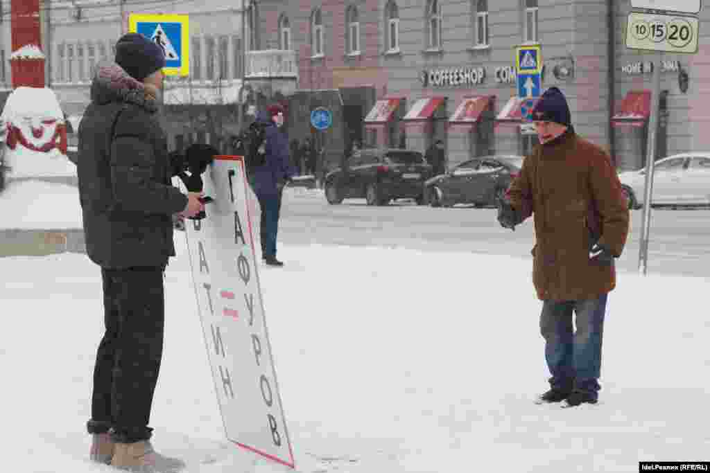 Соловьёв простоял на площади Свободы около часа. За это время к нему подошли четверо человек. Первым оказался мужчина с рацией, представившийся "стажёром" — вместо удостоверения полицейского он показал какую-то справку, следующим был росгвардеец, переписавший паспортные данные пикетчика, третьей оказалась сотрудница канцелярии Кабмина РТ, предложившая Алексею оставить заявление. Наконец, четвёртым был пожилой мужчина, спросивший, кто, по мнению Соловьёва, стоит за убийствами Бориса Немцова и Анны Политковской. Официального ответа на эти вопросы, как и на вопросы Соловьёва, не получено до сих пор.