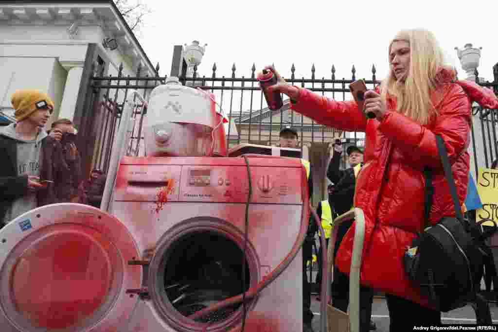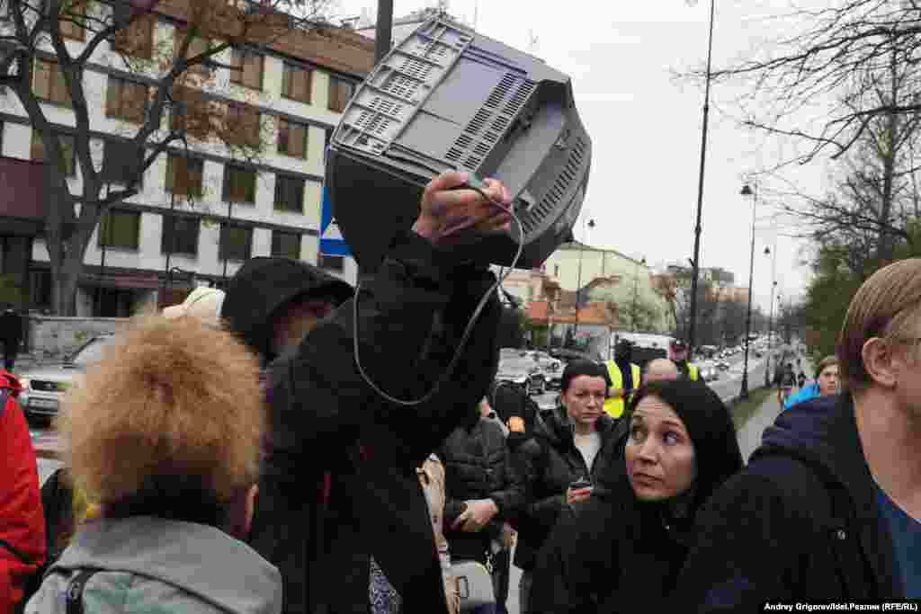 Горы хлама выросли в среду вечером, 13 апреля, перед воротами посольства РФ в Варшаве. Протестующие, среди которых были украинцы, поляки, беларусы, татары и русские, принесли ко входу в посольство на улице Бельведерской бытовую технику, ковры, обувь, игрушки и нижнее белье.