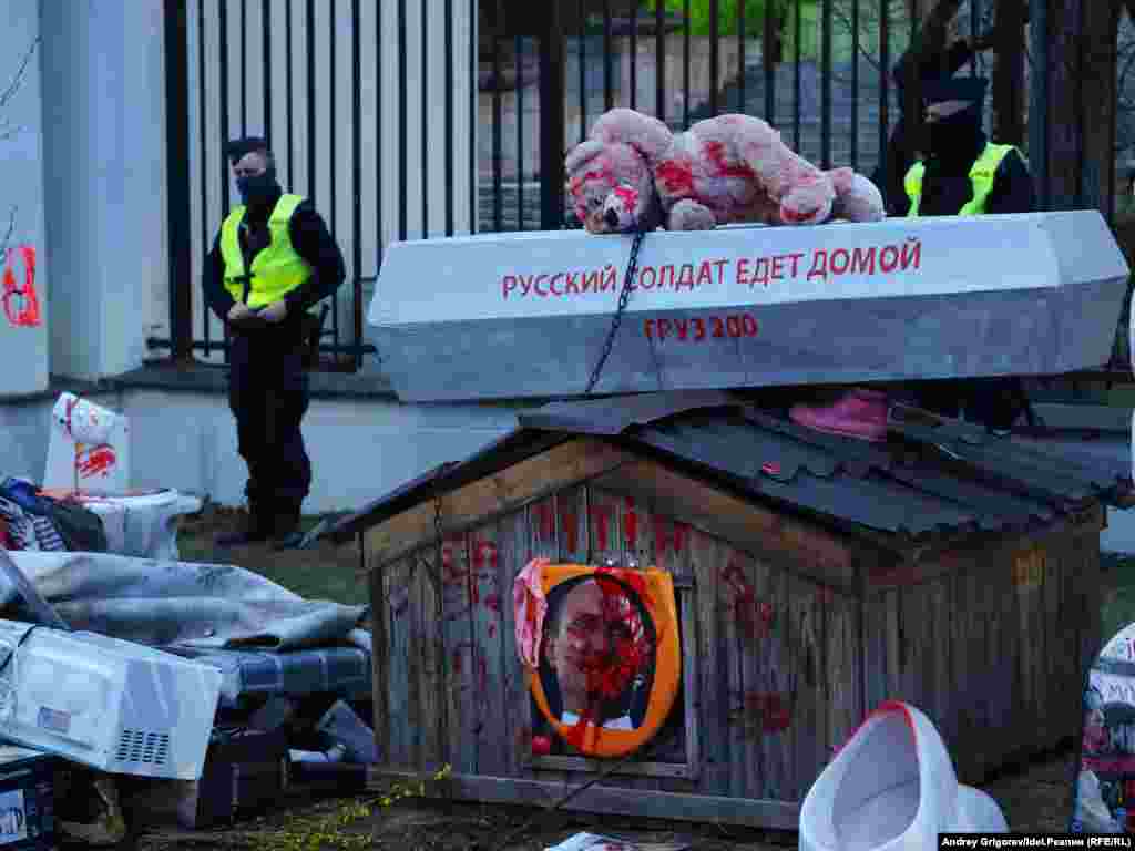 Наибольший фурор вызвало появление у забора посольства собачьей конуры и гроба с надписью "Русский солдат едет домой. Груз 200".