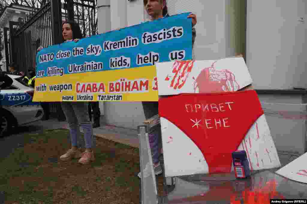 Горы хлама выросли в среду вечером, 13 апреля, перед воротами посольства РФ в Варшаве. Протестующие, среди которых были украинцы, поляки, беларусы, татары и русские, принесли ко входу в посольство на улице Бельведерской бытовую технику, ковры, обувь, игрушки и нижнее белье.