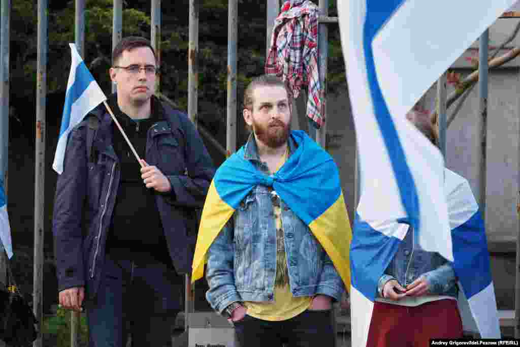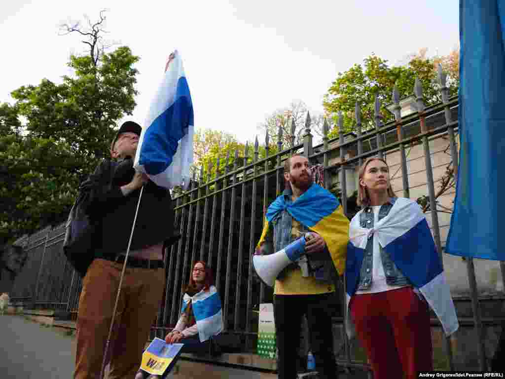 Около двух десятков человек, состоявших главным образом из россиян, собралось вечером 9 мая у посольства РФ в Варшаве, чтобы осудить начатую Россией войну с Украиной.