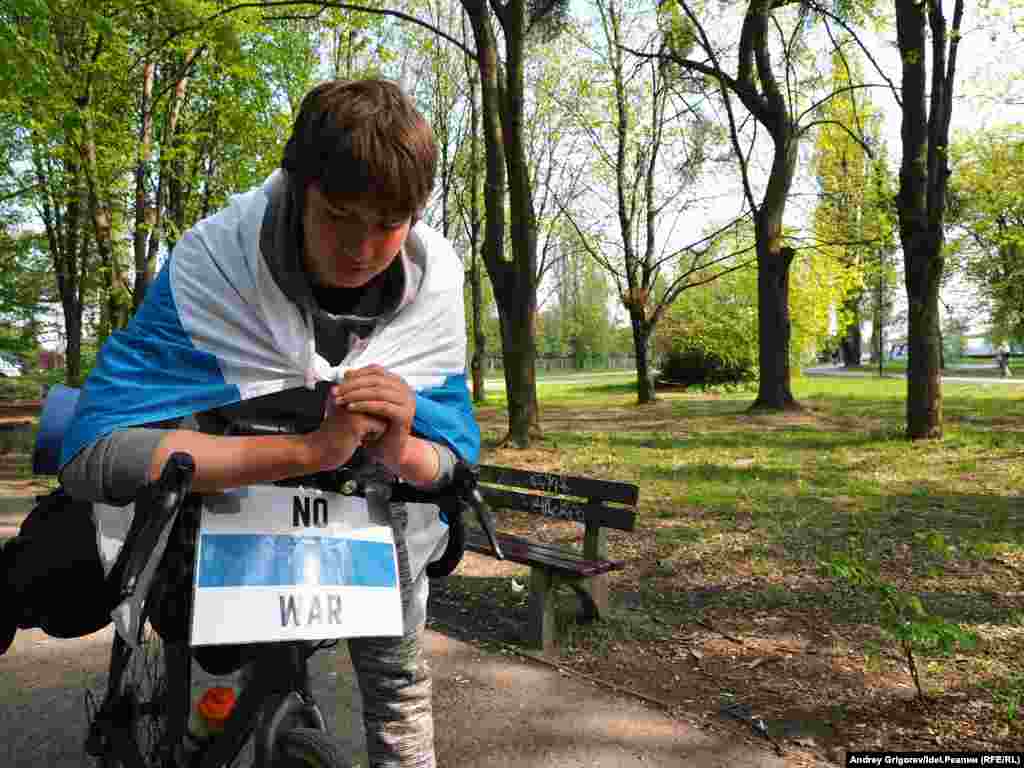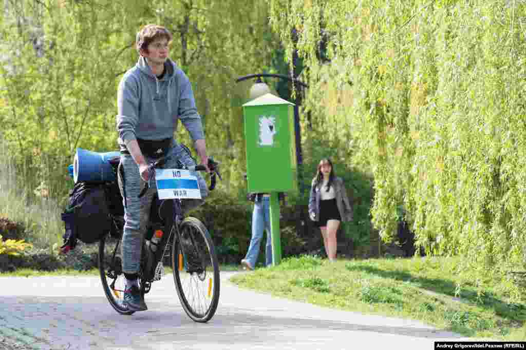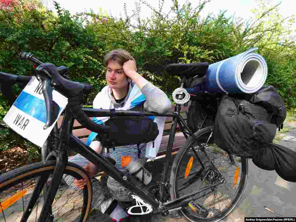 6 марта этот 18-летний парень сел на велосипед, прикрепил к нему российский триколор, плакат "Russians are not Putin" и отправился колесить по Европе. С тех пор он намотал больше трёх тысяч километров, а его флаг стал бело-сине-белым расцветки. Monokov, так он просит называть себя, родился в Нижнем Новгороде, но с шести лет жил в Италии. Конечная точка его путешествия — Россия. Именно поэтому он не хочет разглашать своё настоящее имя.