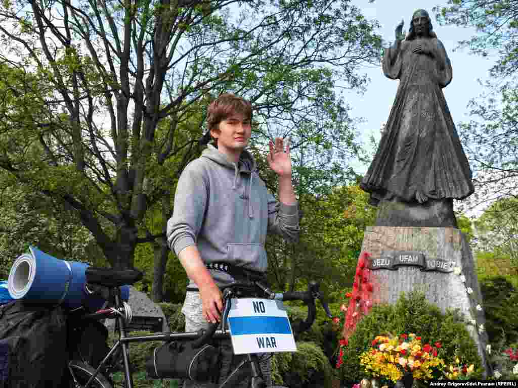 6 марта этот 18-летний парень сел на велосипед, прикрепил к нему российский триколор, плакат "Russians are not Putin" и отправился колесить по Европе. С тех пор он намотал больше трёх тысяч километров, а его флаг стал бело-сине-белым расцветки. Monokov, так он просит называть себя, родился в Нижнем Новгороде, но с шести лет жил в Италии. Конечная точка его путешествия — Россия. Именно поэтому он не хочет разглашать своё настоящее имя.