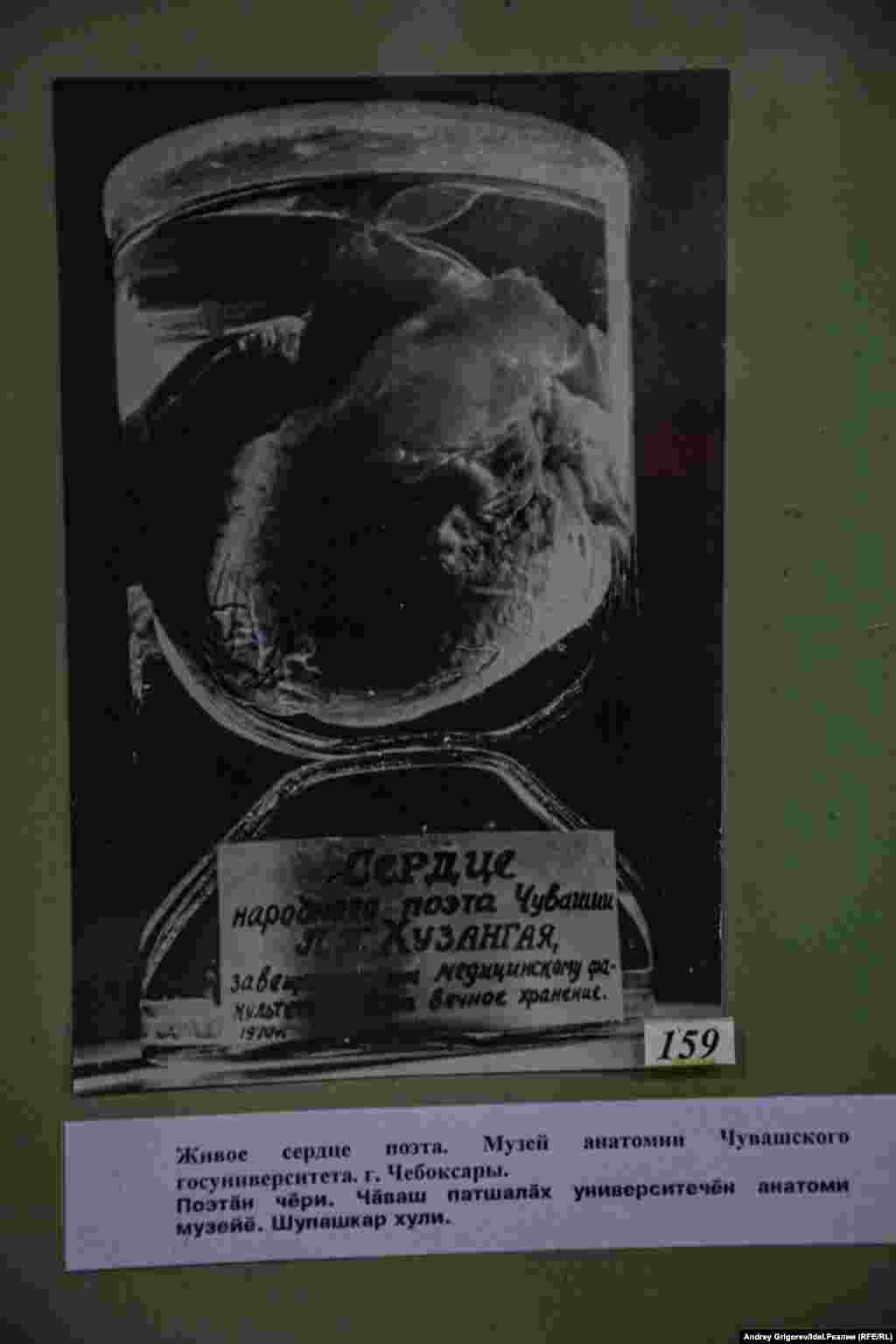 Вторая половина названия, Хузангаево, призвана была сгладить шок, который случался у татарской общественности при виде на дорожных указателях первой части. Пётр Хузангай — чувашский поэт, памяти которого в Сиктерме-Хузангаево посвящен целый музей. В нем корреспондент "Idel.Реалии" побывал несколько лет назад и обнаружил несколько любопытных экспонатов. Например, подаренная поэту трость ручной работы, по которой карабкается обнажённая девушка (снимки 8-9). Или — фотография заспиртованного сердца поэта, переданного "на вечное хранение" музею анатомии Чувашского госуниверситета (снимок 10). "Живое сердце поэта" — так подписан этот снимок.