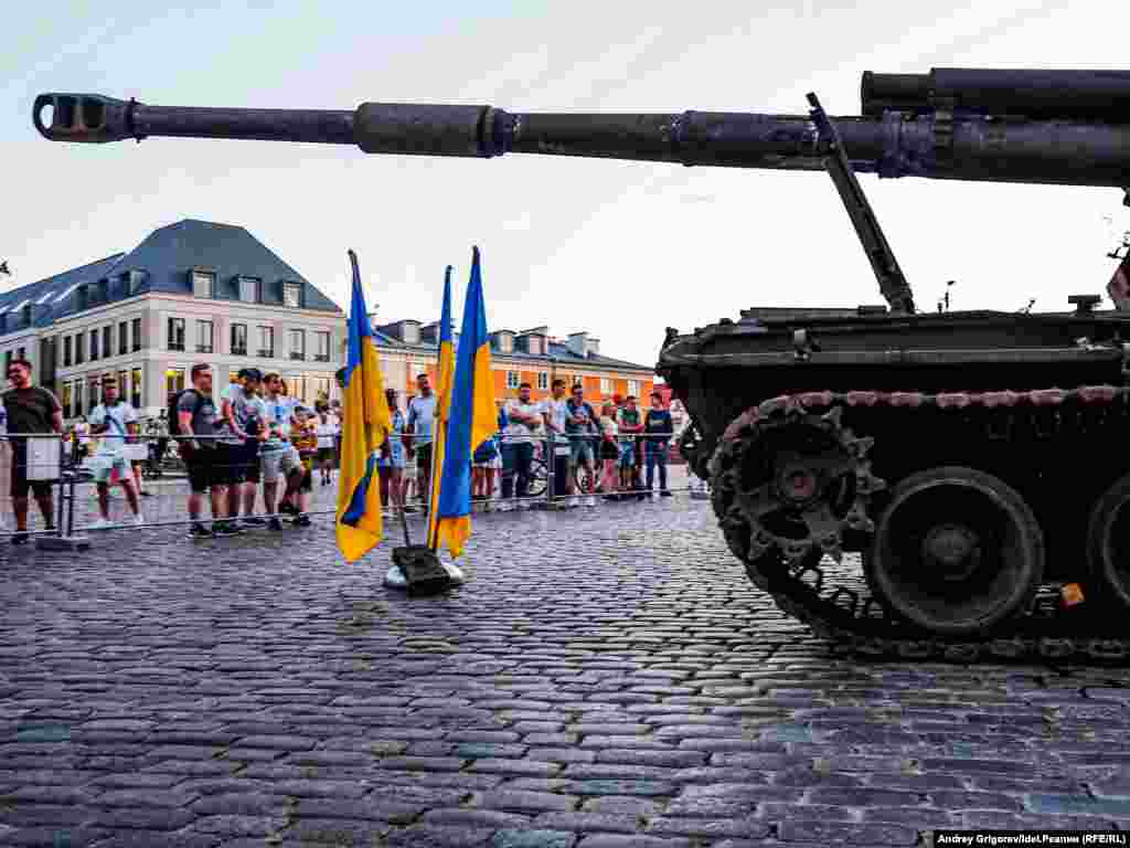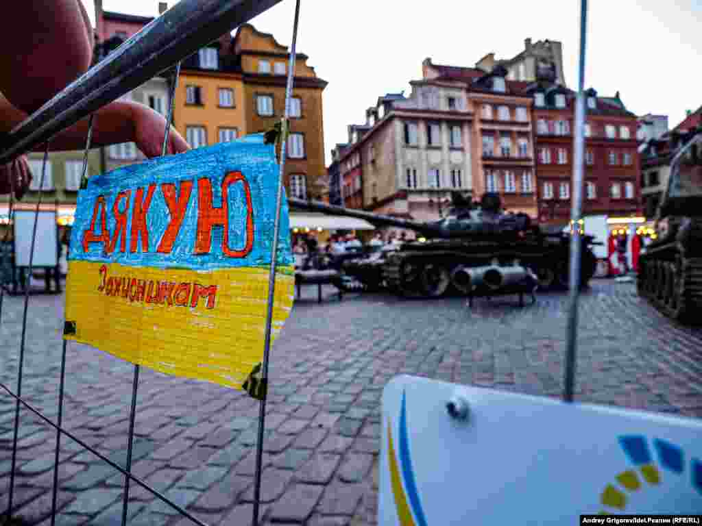 "За вашу и нашу победу!" — так называется выставка, которая открылась прямо под открытым небом на Замковой площади Варшавы в конце июня. На выставке представлена трофейная техника, подбитая украинскими военными весной 2022 года: танк Т-72БА и самоходно-артиллеристская установка 2С19 "МСТА-С". Танк, как следует из пояснений на стенде, был подбит в бою 31 марта на окране села Дмитровка Бучанского района Киевской области. Рядом с танком найдено тело российского танкиста и документы на имя Юрия Дайнзанова. Как гласит надпись на развороте удостоверения, командир танкового взвода лейтенант Юрий Дайнзанов, родившийся 14 февраля 2000, окончил 30 июля 2021 года Казанское высшее танковое командное училище. Место постоянной дислокации войсковой части 46104 — станция Дивизионная под Улан-Удэ в Бурятии.