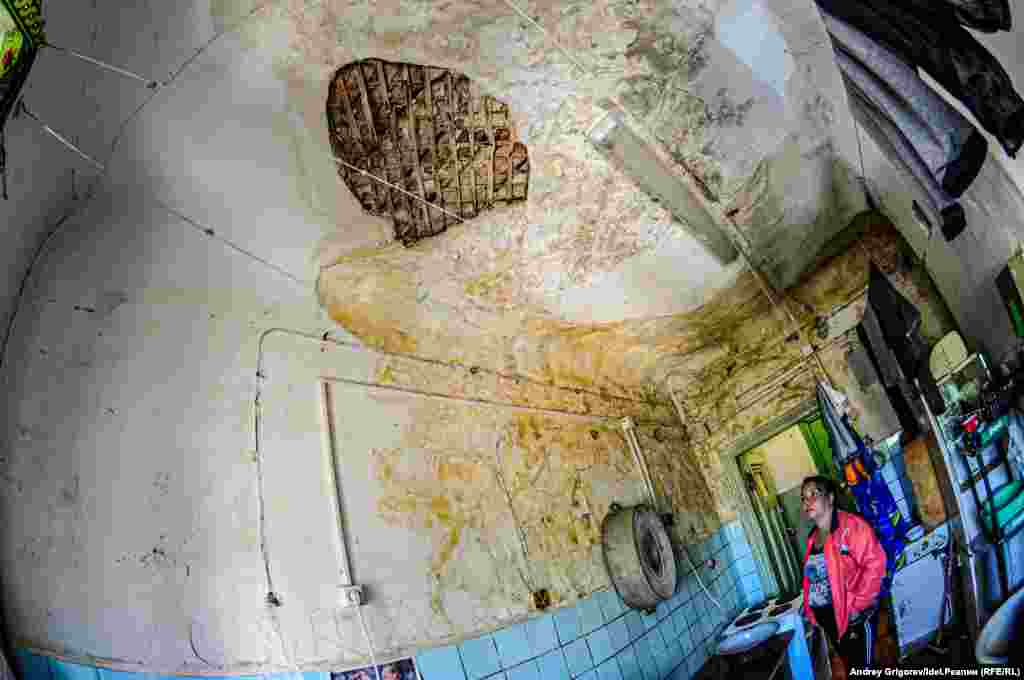 Бывшее общежитие завода обозных деталей на Мало-Московской, 30/13 тоже успели последовательно признать и градоформирующим историческим объектом (2017-й), и аварийным зданием (2018 год). Внутри обшарпанное здание выглядит ещё хуже: щели, штукатурка со стен и потолка отваливается кусками. «Удобства», кстати, расположены в дворе здания.