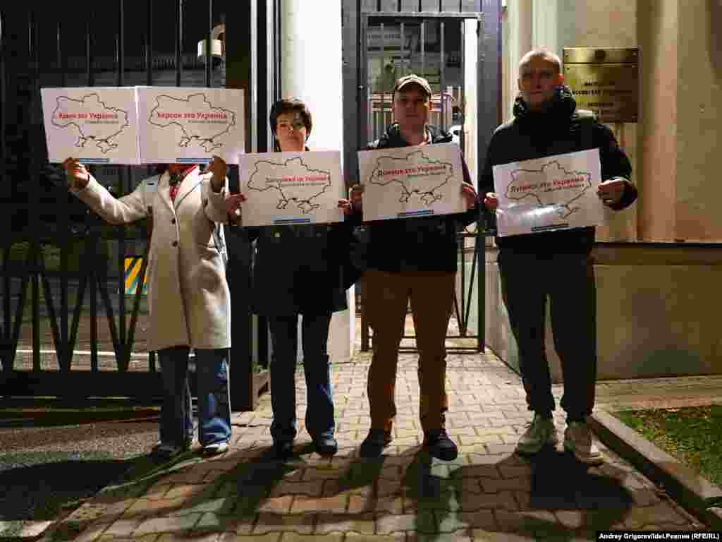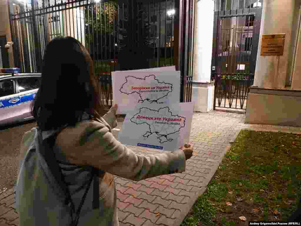 Еще одной точкой на пятничном маршруте российских активистов стало посольство РФ в Польше. У ворот активисты развернули плакаты, напоминающие, чьими по праву являются аннексированные и включенные в состав России территории Украины.