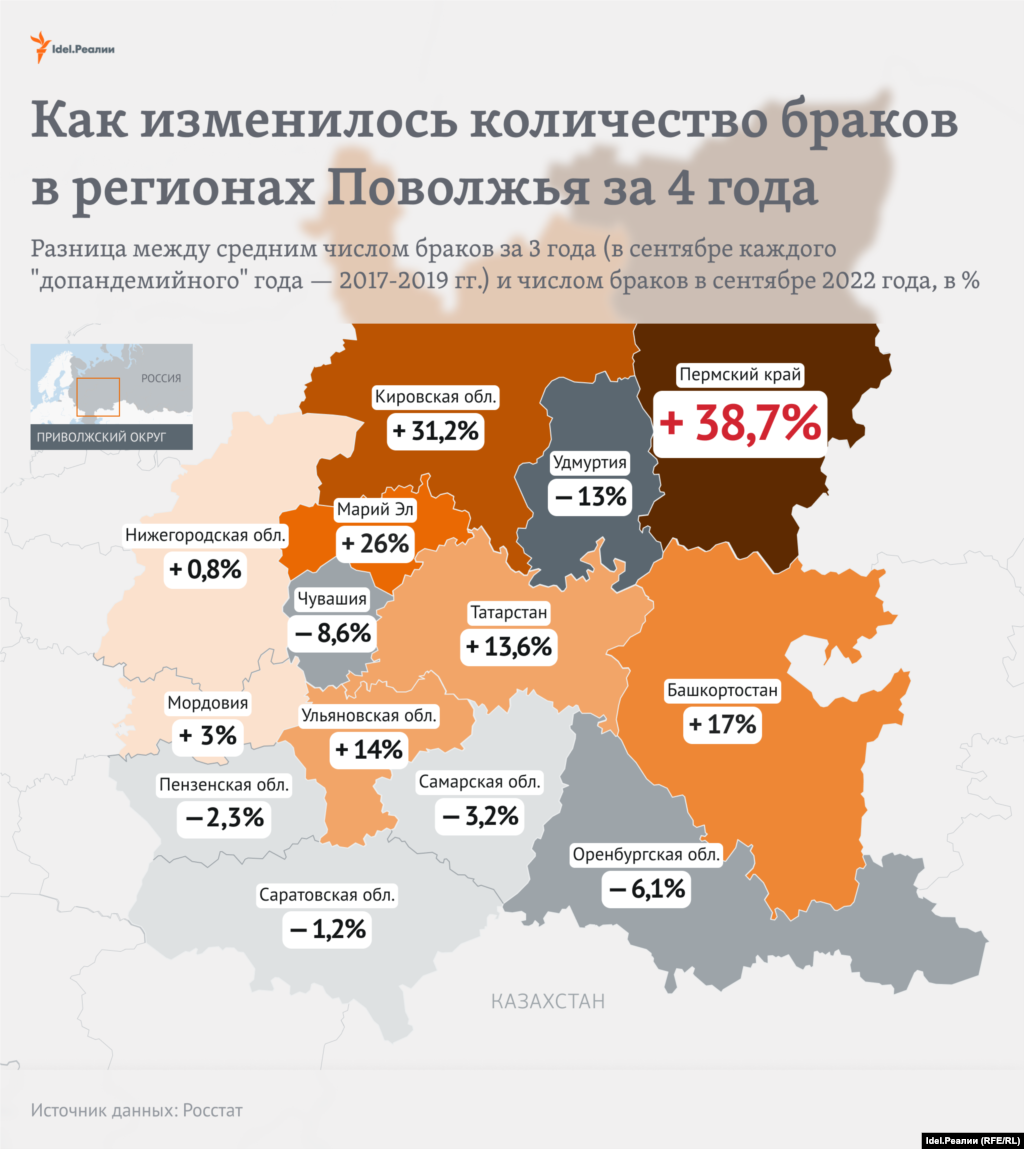 Так, в Пермском крае количество браков в сентябре 2022 года выросло на 38,7%. По этому показателю регион на первом месте. На втором месте — Кировская область с ростом в 31,2%, на третьем месте — Марий Эл с ростом в 26%.