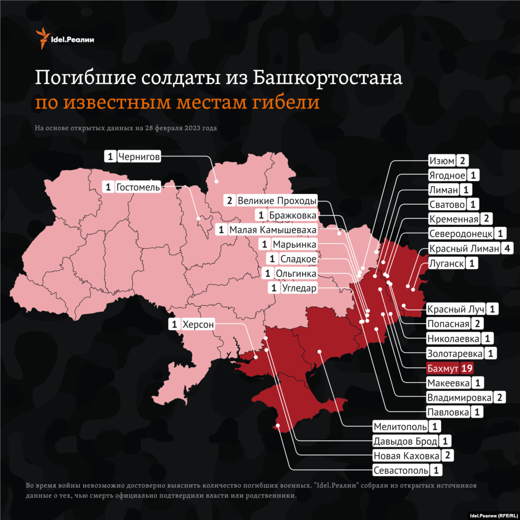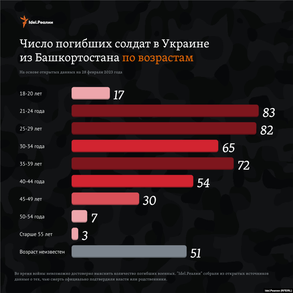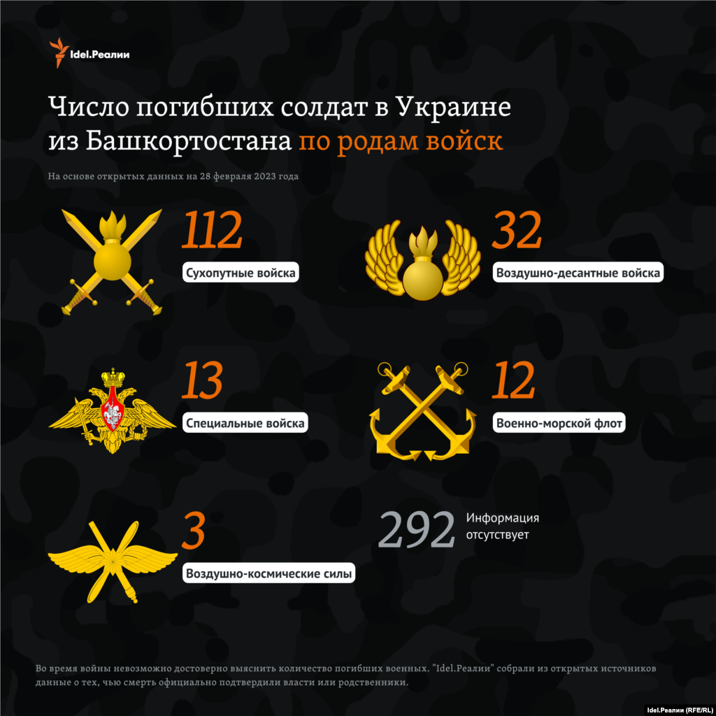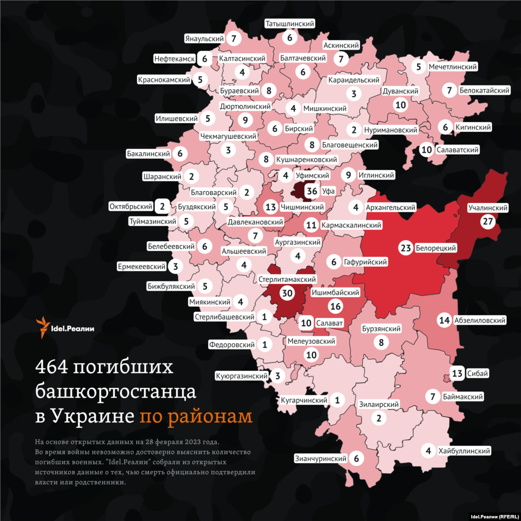 По подсчетам "Idel.Реалии" на конец февраля 2023 года на основе открытых данных, погибшими из Башкортостана на войне, которую Россия ведет в Украине, оказались 464 человека.