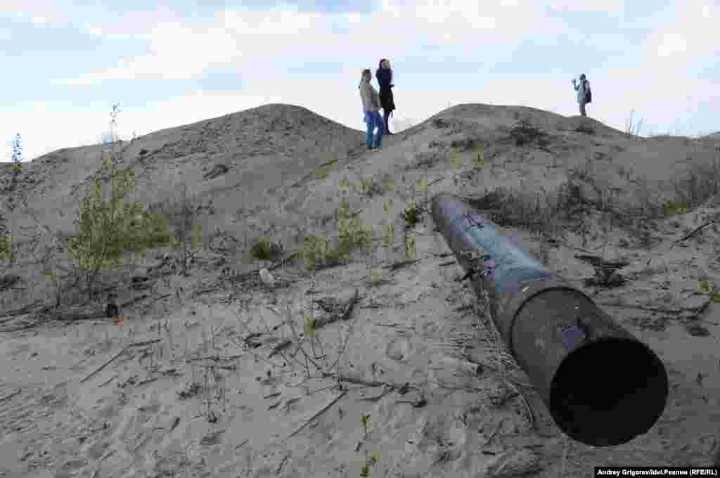 Перед вами уникальные кадры 2015 года: чиновники Минэкологии Татарстана вместе с экоактивистами и жителями Займища обследуют земельные участки, намытые на Волге структурами олигарха Равиля Зиганшина. Можно заметить, что новая суша возвышается над водой на несколько метров. Причем рабочие уже успели частично уложить коммуникации (например, торчащую из бархана трубу на заглавном фото) и установить несколько опор будущего моста.