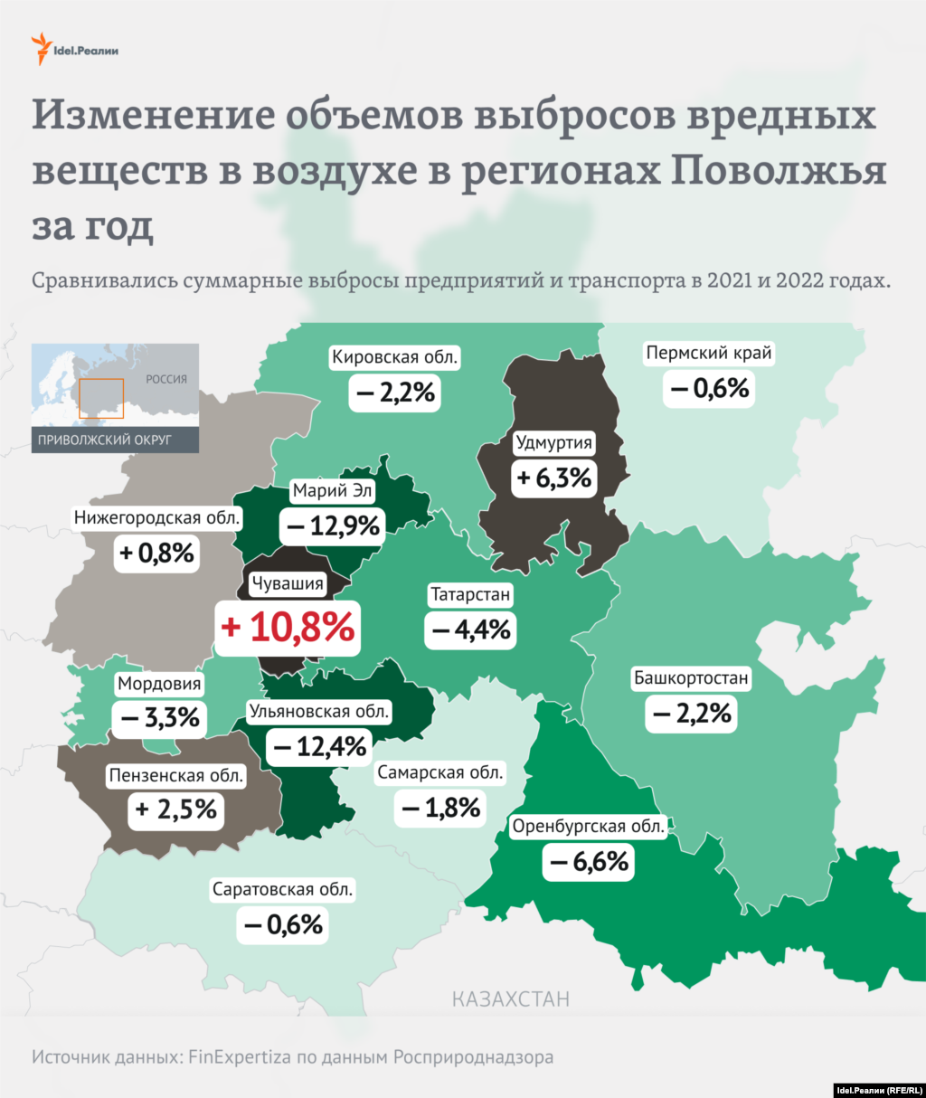 Среди регионов ПФО наиболее заметно выбросы сократились в Марий Эл — на 12,9%. Затем по этому показателю идут Ульяновская (— 12,4%) и Оренбургская области (— 6,6%).