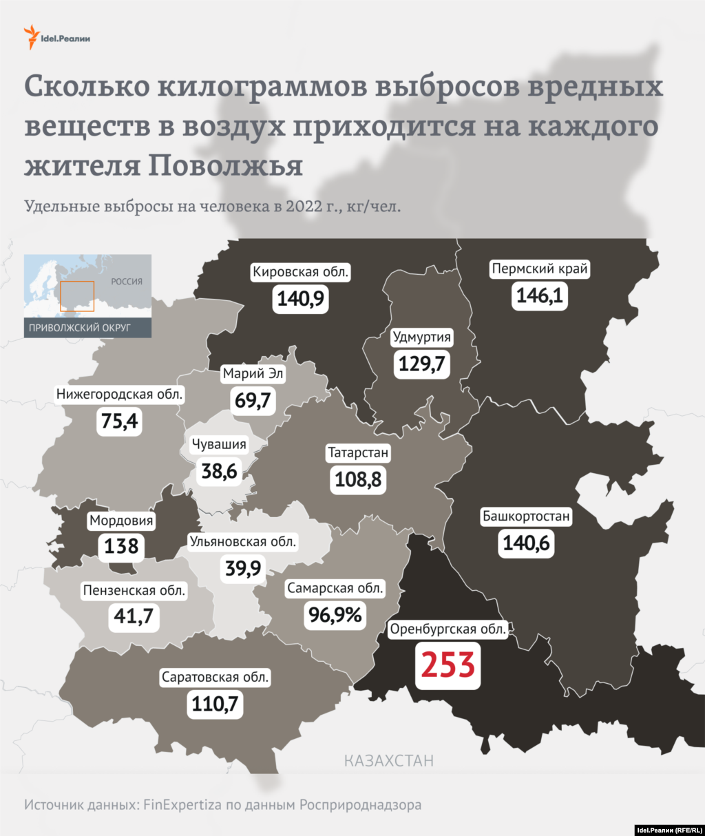 В пересчете на одного жителя Поволжья больше всего загрязняющих веществ фиксируется в Оренбургской области — 253 кг/чел. С заметным отрывом по массе загрязняющих веществ в воздухе на одного жителя идут Пермский край (146,1 кг/чел.), Кировская область (140,9 кг/чел.) и Башкортостан (140,6 кг/чел.).