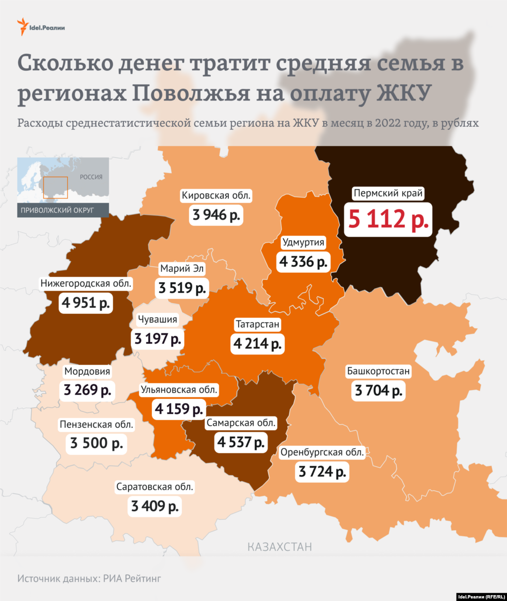 Самые большие расходы семьи на оплату коммунальных услуг в 2022-м году в Поволжье зафиксированы в Пермском крае — 5 112 рублей.
