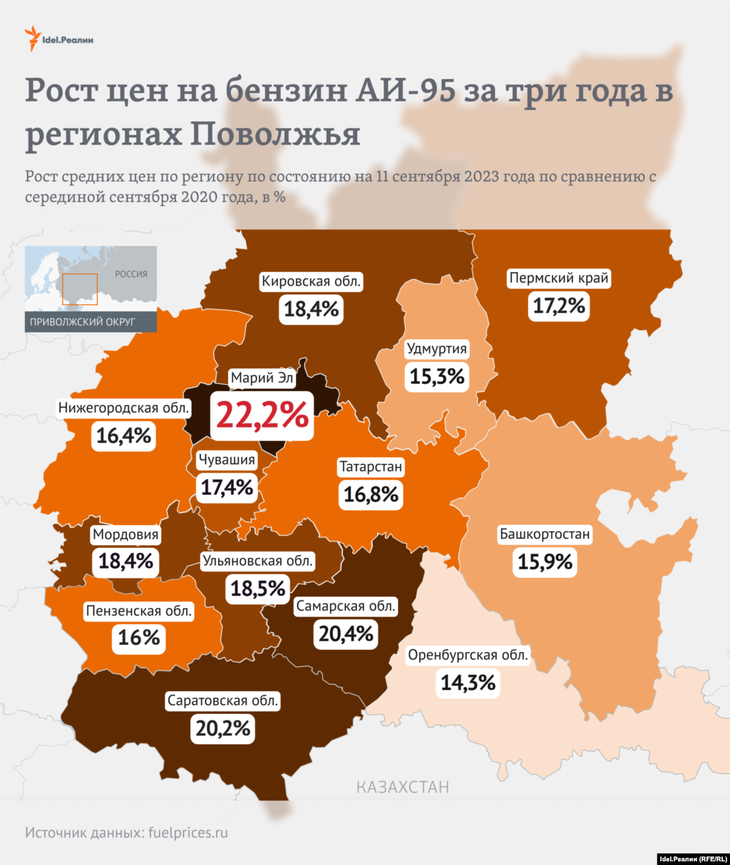 Бензин марки АИ-95 за три года сильнее всего вырос в Марий Эл — на 22,2%, в Самарской (+20,4%) и Саратовской областях (+20,2%).