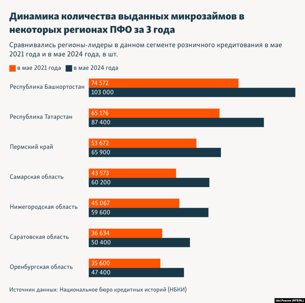 На третьем месте по росту количества выданных микрокредитов — Саратовская область (+37,7%): 36,6 тыс. микрозаймов в 2021-м против 50,4 тыс. в 2024-м).