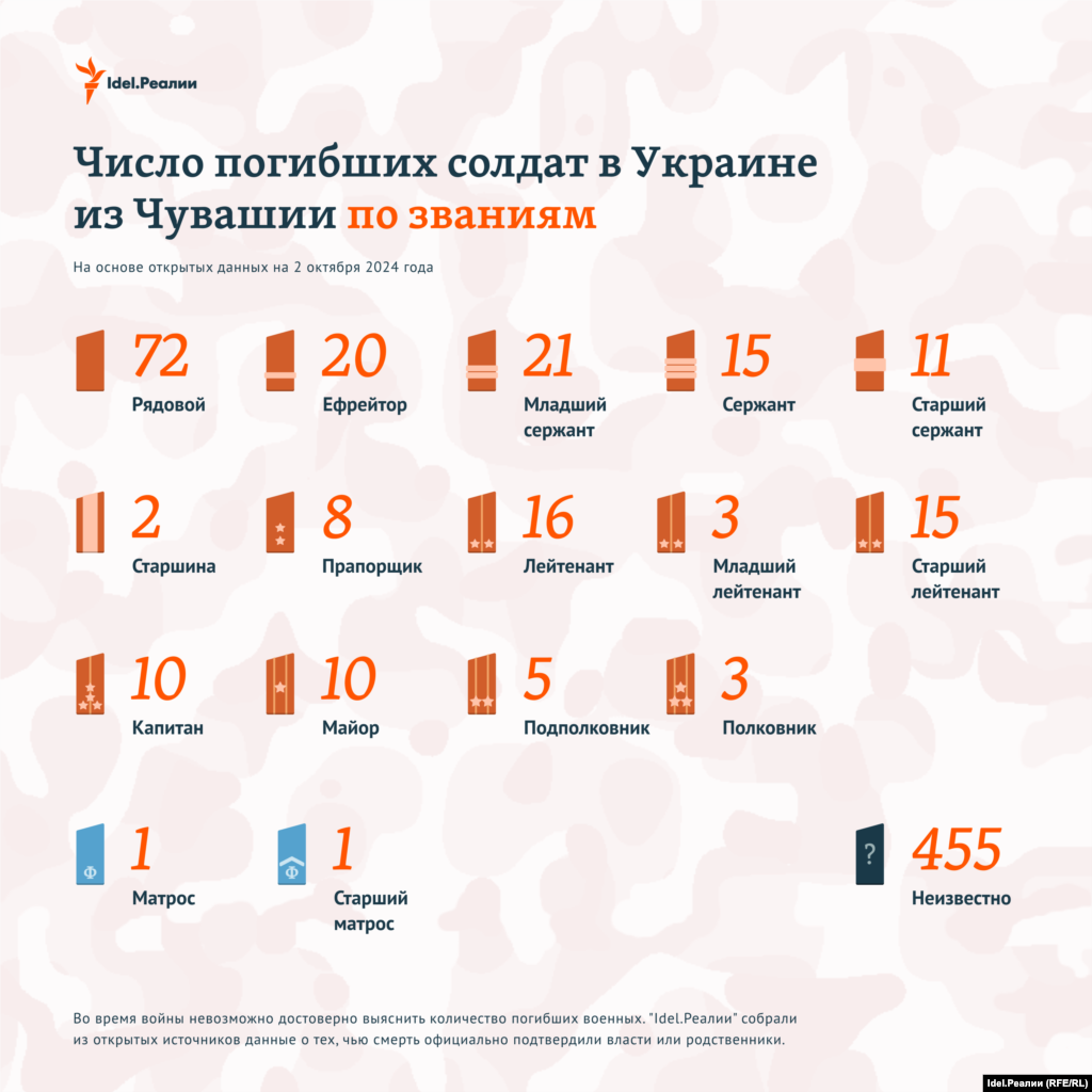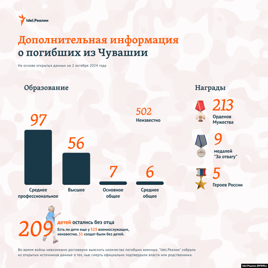 "Idel.Реалии" собрали всю известную на данный момент информацию о погибших на войне уроженцах Чувашии — возраст, звания, районы, образование, дети, медали и др. Всего, по данным на 2 октября 2024 года, погибшими признаны как минимум 668 человек из Чувашии.