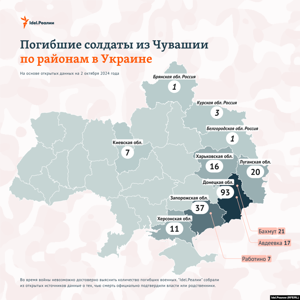 Больше всего погибших из Чувашии фиксируется в Донецкой области Украины — 93.