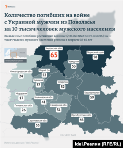 Об этом свидетельствуют расчеты "Idel.Реалии" на 9 октября, основанные на данных из базы погибших уроженцев Поволжья с начала полномасштабного вторжения России в Украину.