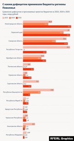 Следом за ней идут Пермский край — 27,1 млрд рублей (на 2024 год — 23,3 млрд рублей), Самарская область — 28,8 млрд рублей (на 2024 год — 18,8 млрд рублей), Татарстан — 13,5 млрд рублей (на 2024 год бюджет был бездефицитным) и Оренбургская область — 13,2 млрд рублей против 10,5 млрд рублей в 2024 году.