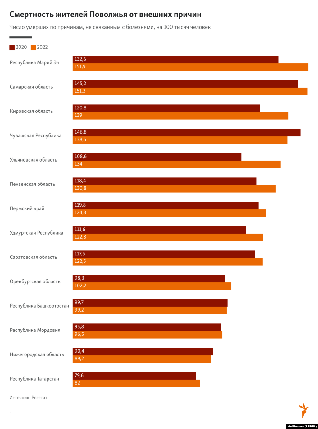 В некоторых регионах Поволжья выросли смертность и получение травм и отравлений за последние два года. По итогам 2022 года, на первом месте по числу умерших от не связанных с болезнями причин на 100 тысяч человек населения оказалась республика Марий Эл — 151,9 человек. В 2020 году этот показатель был 132,6.