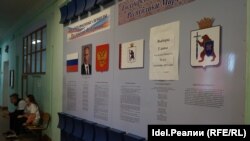 Йошкар-Ола, УИК №6. В коридоре перед входом на участок висит стенд с портретом Владимира Путина. Рядом висел другой портрет, но его заклеили. Как выяснили "Idel.Реалии", за бумагами формата А4 висит портрет экс-главы республики Леонида Маркелова, который сейчас находится в СИЗО по подозрению в получении многомиллионной взятки.